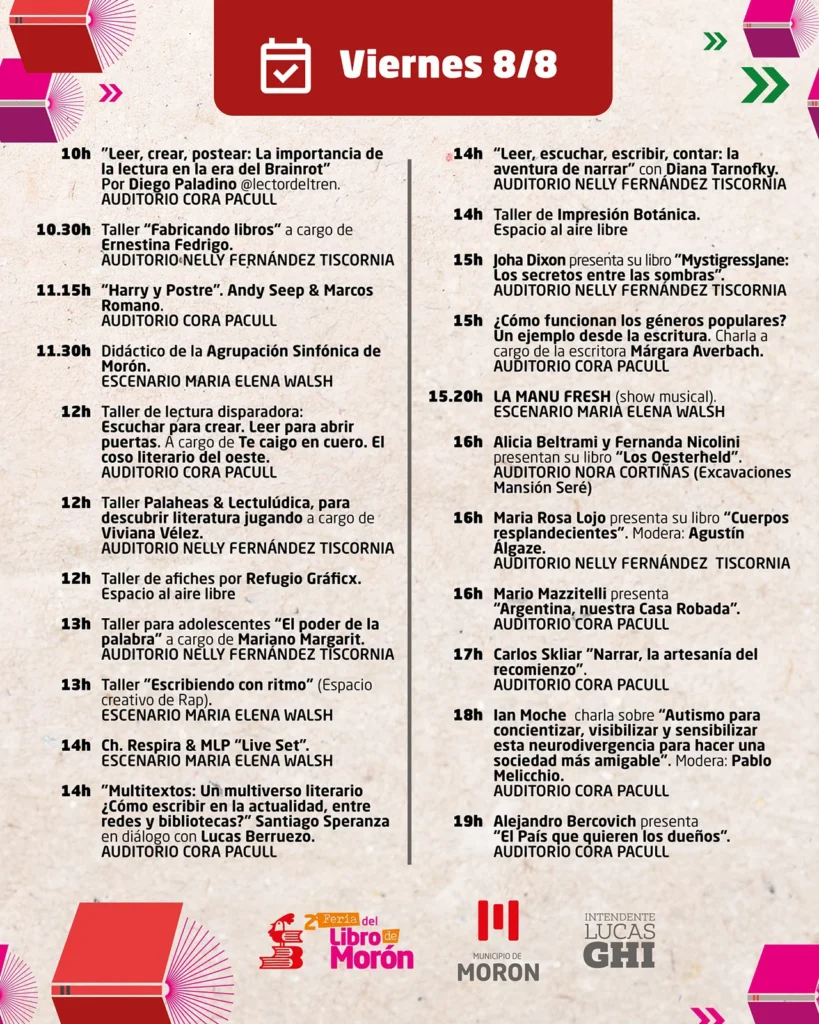 El viernes 8, las actividades continuarán con nuevas propuestas: a las 14 se presentará Santiago Speranza; a las 15 será el turno de Márgara Averbach; a las 17 expondrá Carlos Skliar; a las 18 Ian Moche conversará con Pablo Mellichio; y a las 19 Alejandro Bercovich cerrará la jornada.